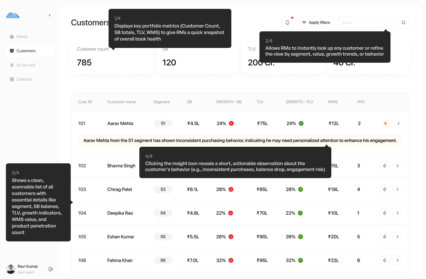 The customer list page is designed to help RMs quickly scan, compare, and prioritize customers by combining key portfolio metrics, clear growth indicators, and actionable AI insights in a clean, easily navigable table.
