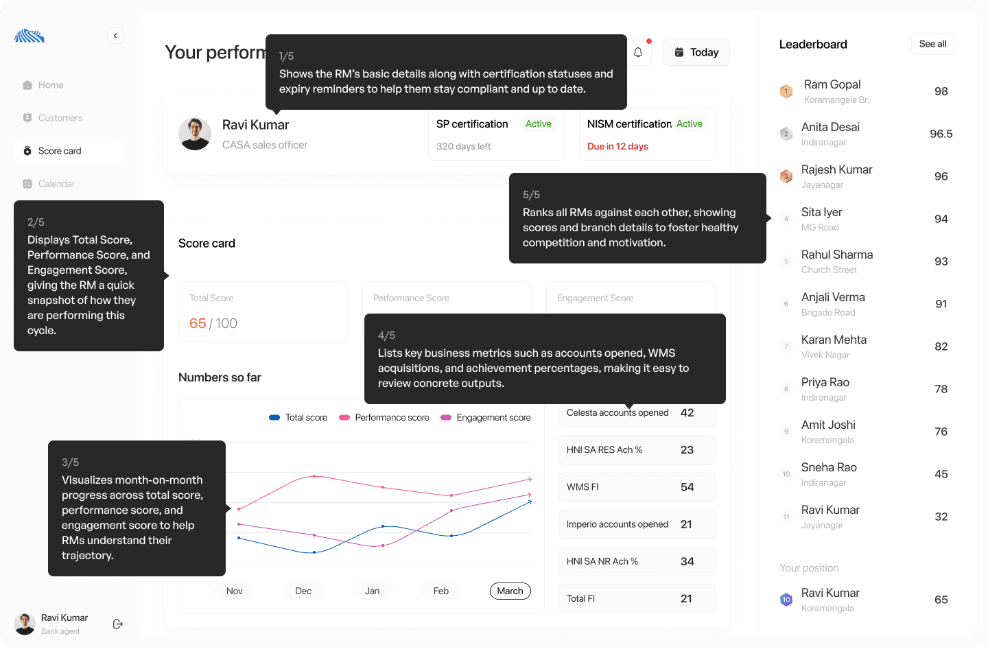 The performance page is designed to give RMs a clear, motivating view of their scores, progress trends, key business metrics, and leaderboard standing, helping them quickly understand how they’re performing and where to improve.