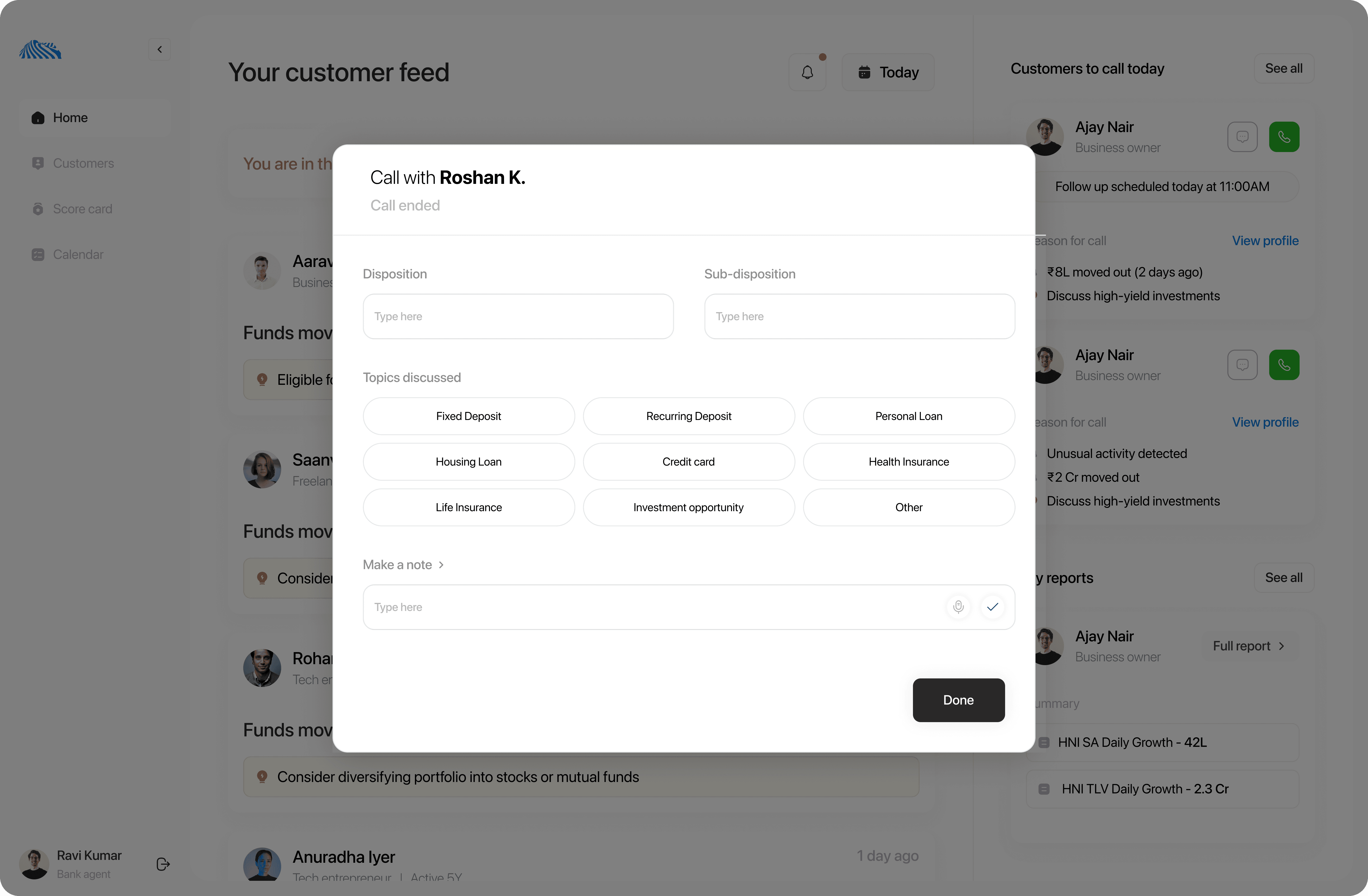 The call-end screen allows RMs to quickly log disposition, topics discussed, and notes, ensuring clean and consistent post-call documentation