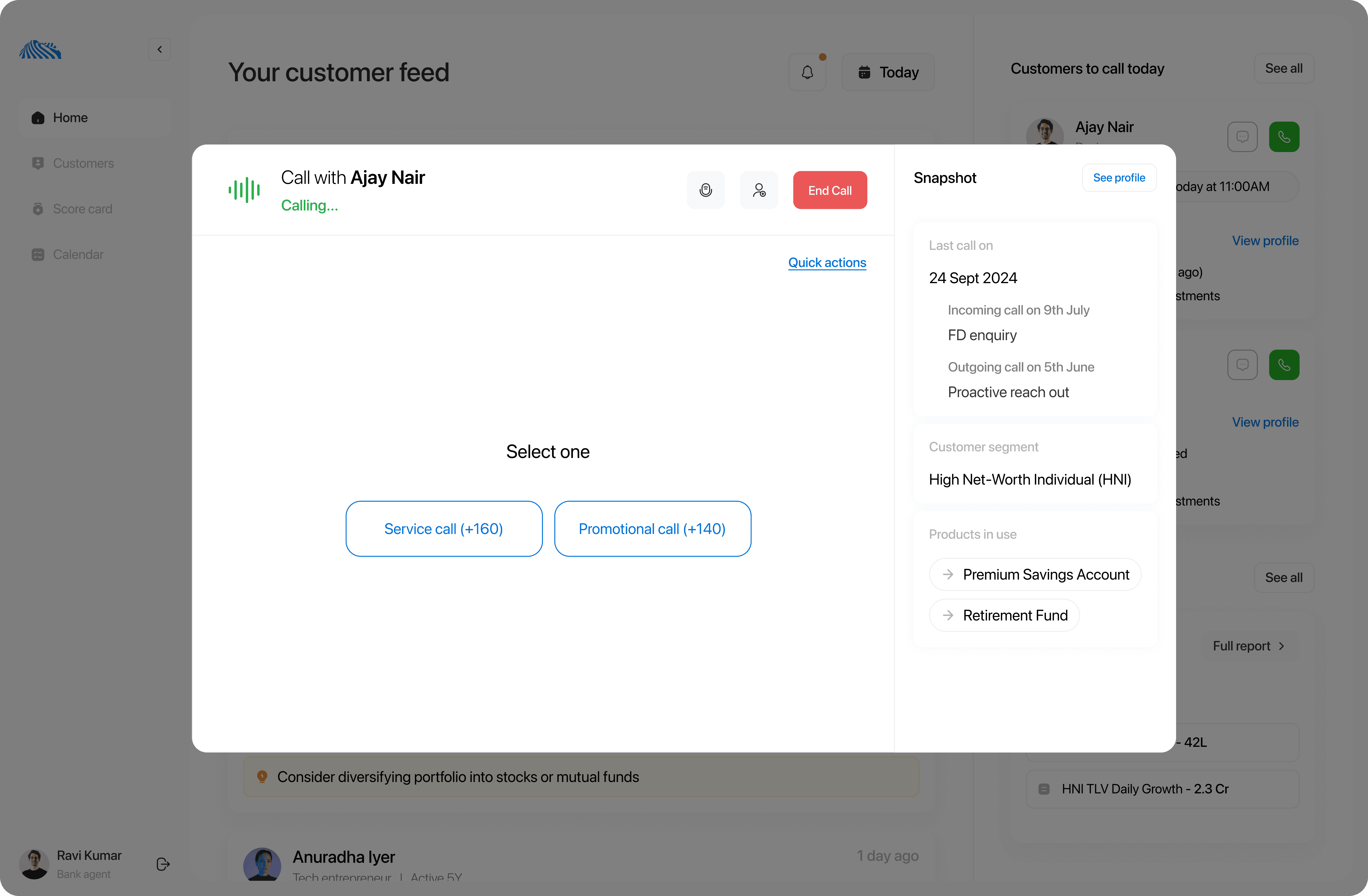 The calling screen helps RMs identify the call type instantly while showing a quick customer snapshot to guide the conversation.
