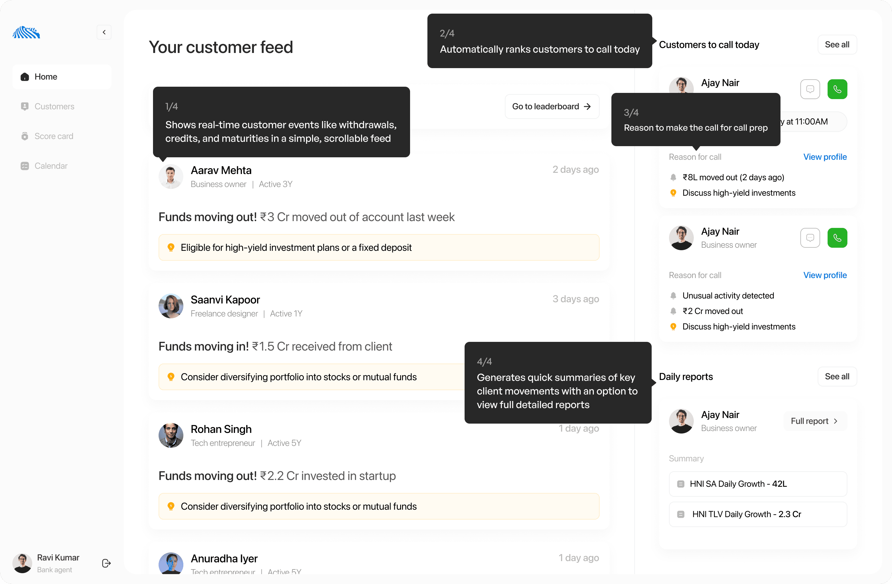 Banks expect RMs to deliver personalized, timely engagement, but outdated systems and disconnected workflows make this nearly impossible. RMs need a single, intelligent platform that consolidates customer insights, prioritizes actions, and supports daily decision-making.